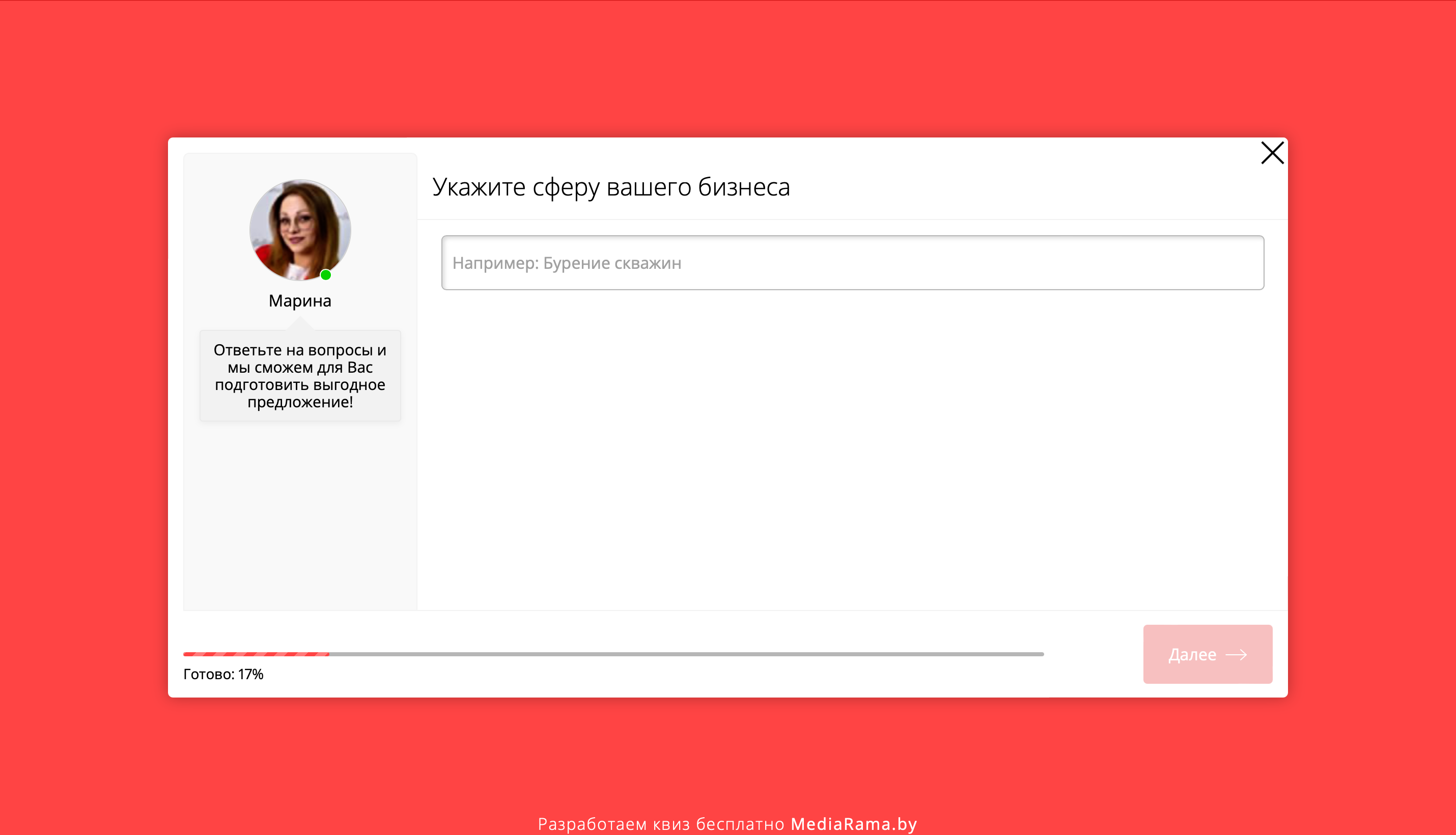 Дополнительная ценность: Предлагая в результате квиза небольшой бонус (например, скидку или полезный совет), вы мотивируете больше людей пройти опрос до конца и оставить заявку.